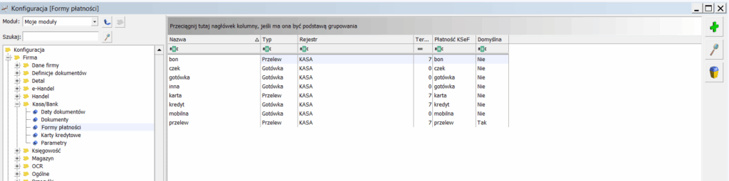 Start→ Konfiguracja→ Firma→ Kasa/Bank→ Formy płatności