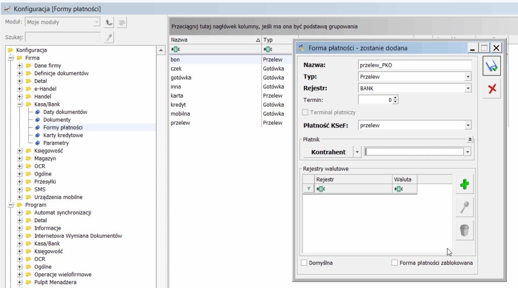 Tutaj możesz zarówno dodać nową formę płatności, jak i zmienić rejestr.