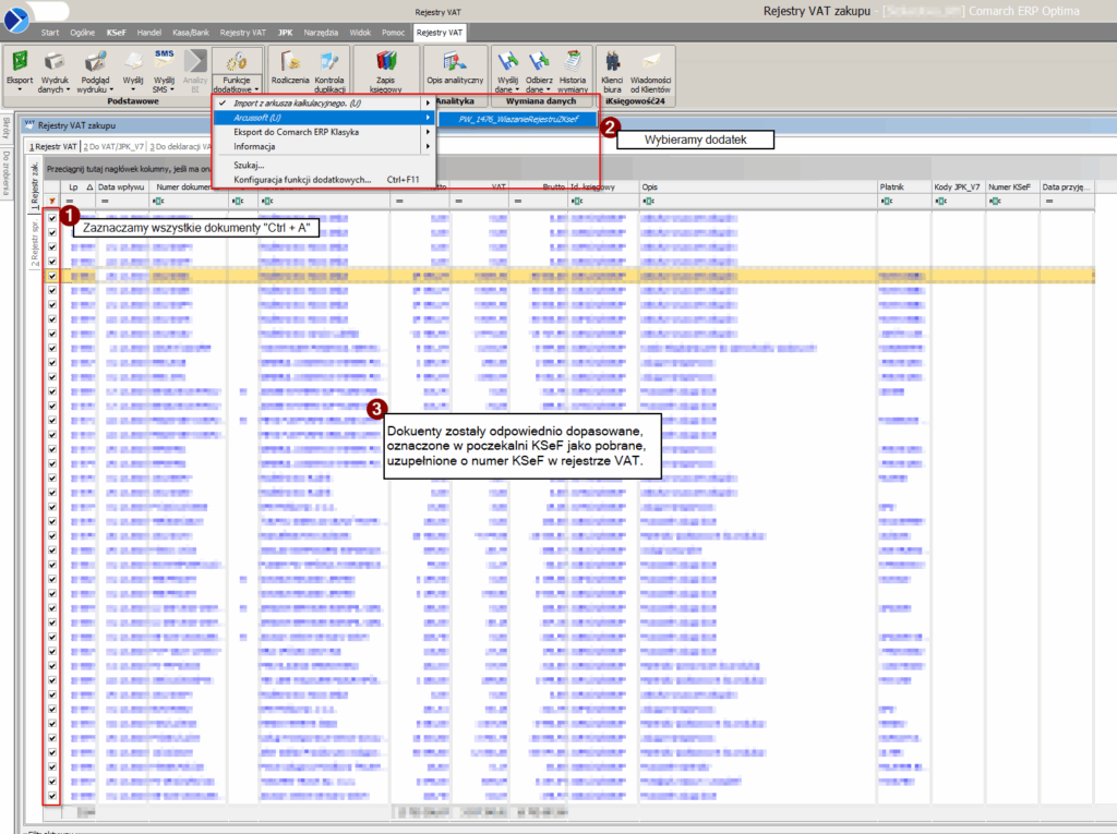 1. Zaznaczasz dokumenty w rejestrze VAT (np. Ctrl + A).